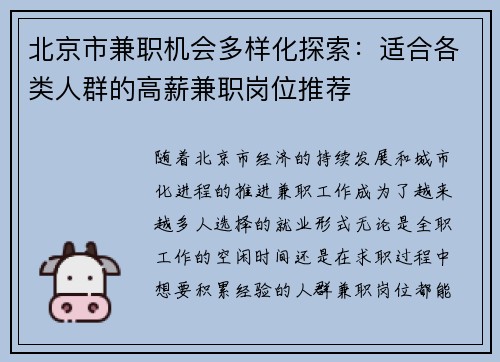随着北京市经济的持续发展和城市化进程的推进,兼职工作成为了越来越多人选择的就业形式。无论是全职工作的空闲时间,还是在求职过程中想要积累经验的人群,兼职岗位都能够满足不同人群的需求。而北京市作为中国的首都,兼职机会的种类和数量也异常丰富。本文将从四个方面详细探讨北京市的兼职机会,包括适合学生的兼职、高薪行业的兼职、灵活时间的兼职以及专业技能型兼职,力求为不同人群提供实用的参考和建议。