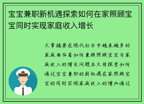 文章摘要:在现代社会中,越来越多的家庭面临着如何兼顾照顾宝宝与家庭收入的增长问题。本文将探索如何通过宝宝兼职的新机遇,在家照顾宝宝的同时实现家庭收入的增加。通过分析多种兼职方式、利用网络平台、家长时间管理技巧和适合的育儿支持等方面的策略,帮助家长更好地平衡家庭和事业。